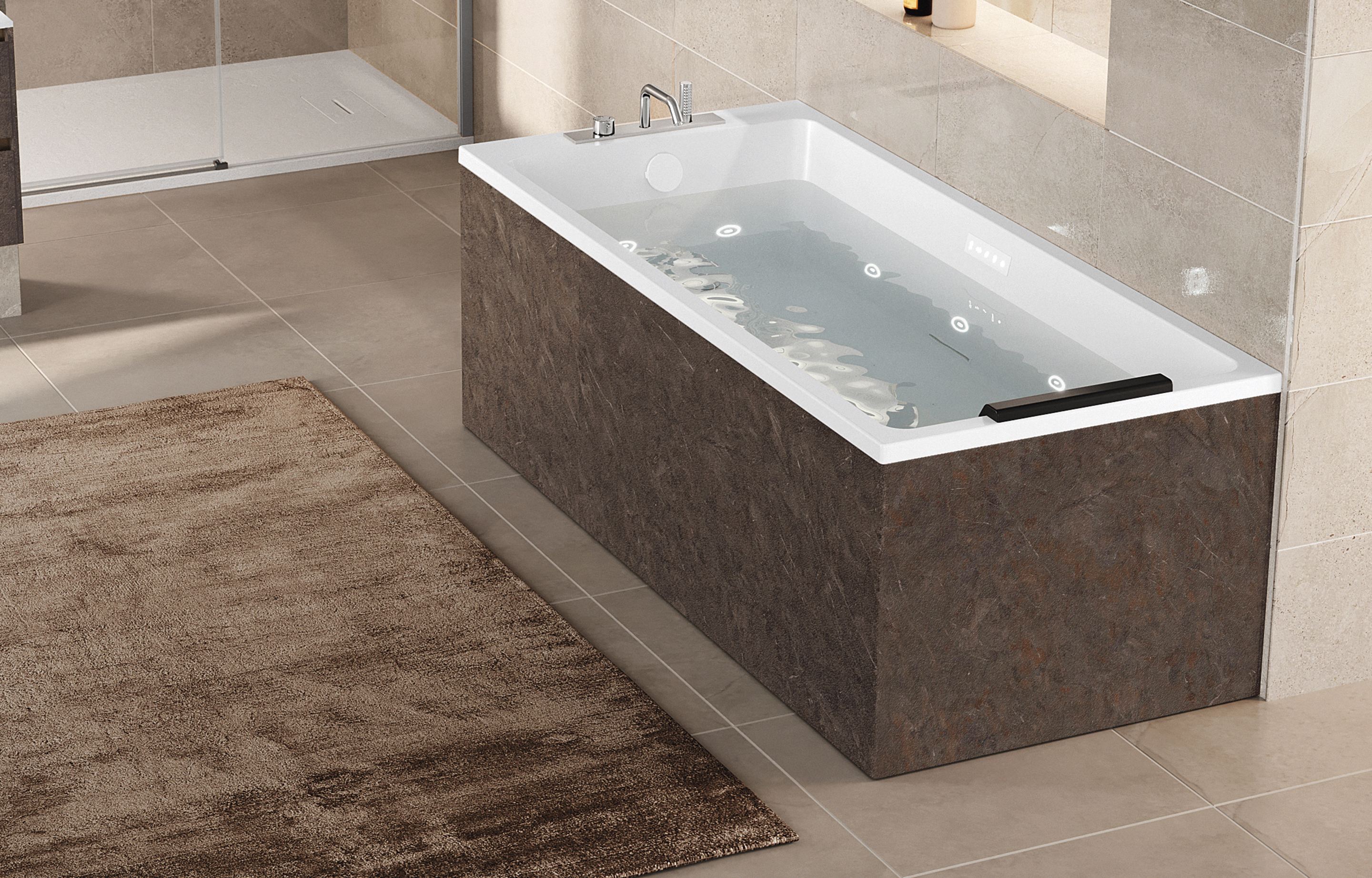 STYLE The new Whirlpool system with integrated Chromolight by Novellini is at the heart of the minimalist design of this new bathtub. Discover more